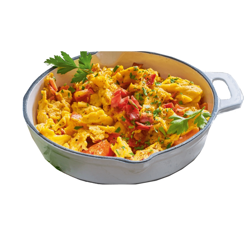 Herzhaftes Rührei mit Schinken, Käse, Zwiebeln, Kirschtomaten – frisch gebraten, mit Petersilie verfeinert.